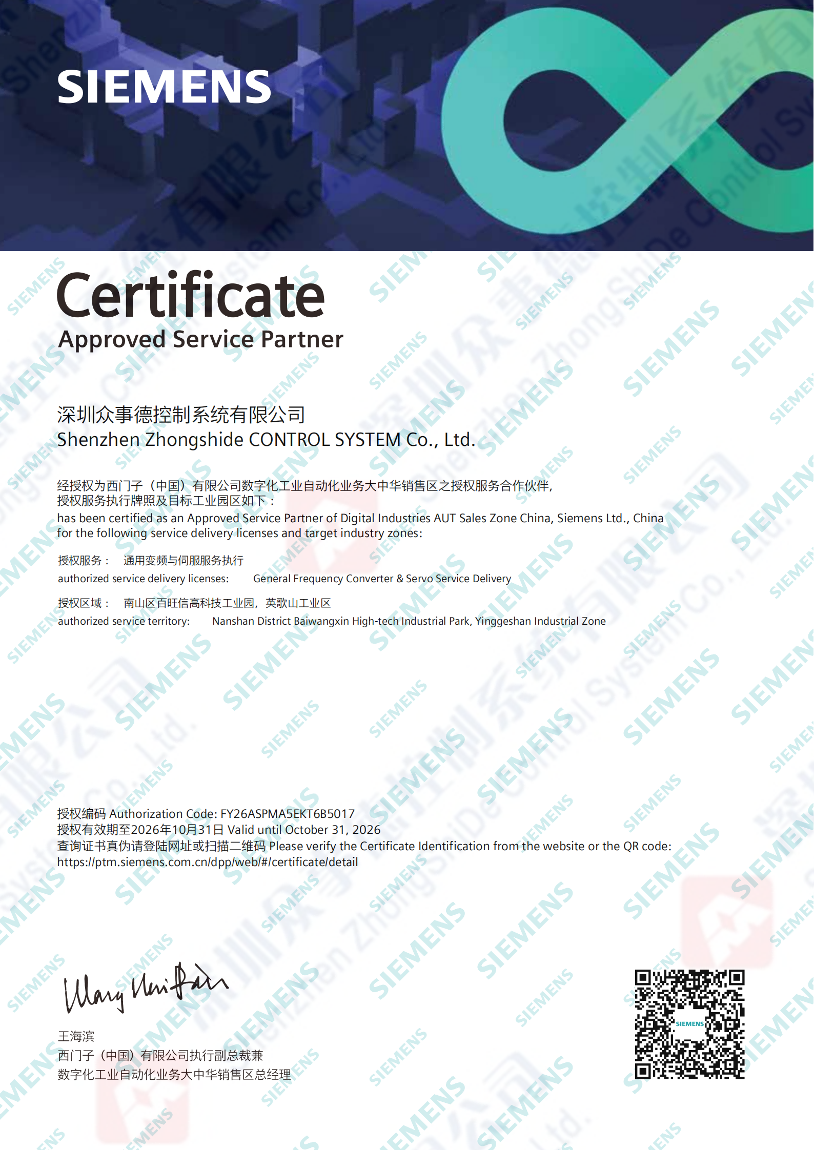 熱烈慶祝眾事德憑借深厚的技術積累、完善的服務體系與良好的市場口碑,正式獲得西門子(中國)有限公司授權,成為西門子授權服務合作伙伴(ASP)。這一授權標志著眾事德的服務能力達到西門子全球統一標準,可代表西門子為客戶提供原廠級的設備維修、保養、技術支持與備件供應服務。